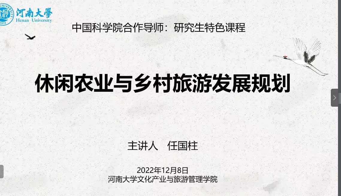 12月8日下午,中国科学院地理科学与资源研究所任国柱研究员以线上方式为学院师生做了题为《休闲农业与乡村旅游发展规划》的学术讲座,讲座由文化产业与旅游管理学院副经理王东峰主持。