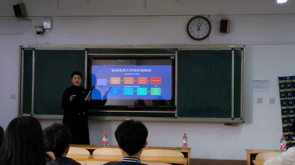 接着,刘屏从市场人才需求和职业规划两方面展开讲解。她强调,要保证自身能力与工作岗位相匹配,把握自身优势,并以此来推动职业规划、选择职业培训。随后,她以首旅南苑集团员工的工作日常和工作环境为例,对集团信息做出进一步说明。